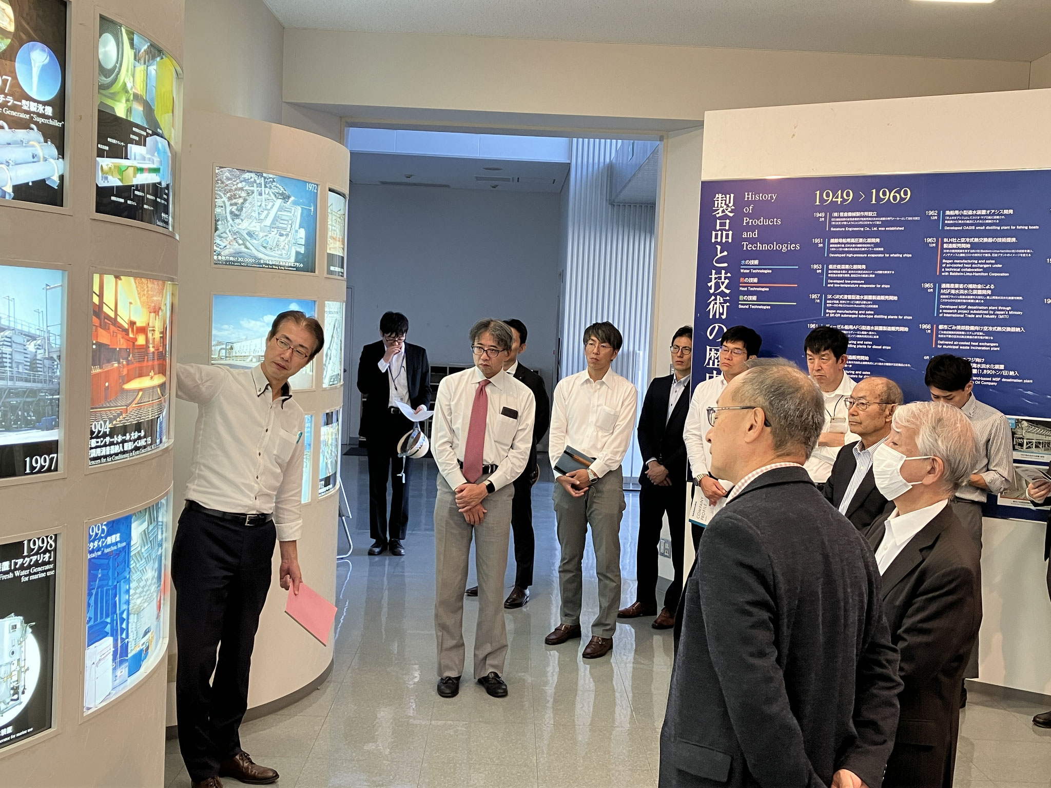 株式会社ササクラ様は、海水淡水化分野のフロントランナーとして、中東地域や舶用向け装置の設計・施工を手掛けてこられました。その高度な分離技術は、海水淡水化にとどまらず、排水・廃棄物処理、ヒートポンプ・熱交換、さらには音響・消音事業など幅広い分野に応用され、社会に貢献しています。今回のイベントでは、これら事業の発展の歴史や、研究開発が進むカーボンリサイクルへの取り組みについてご紹介いただき、さらにテクノプラザに併設された蒸発濃縮装置やヒートポンプの製造現場、実証装置の見学を行いました。